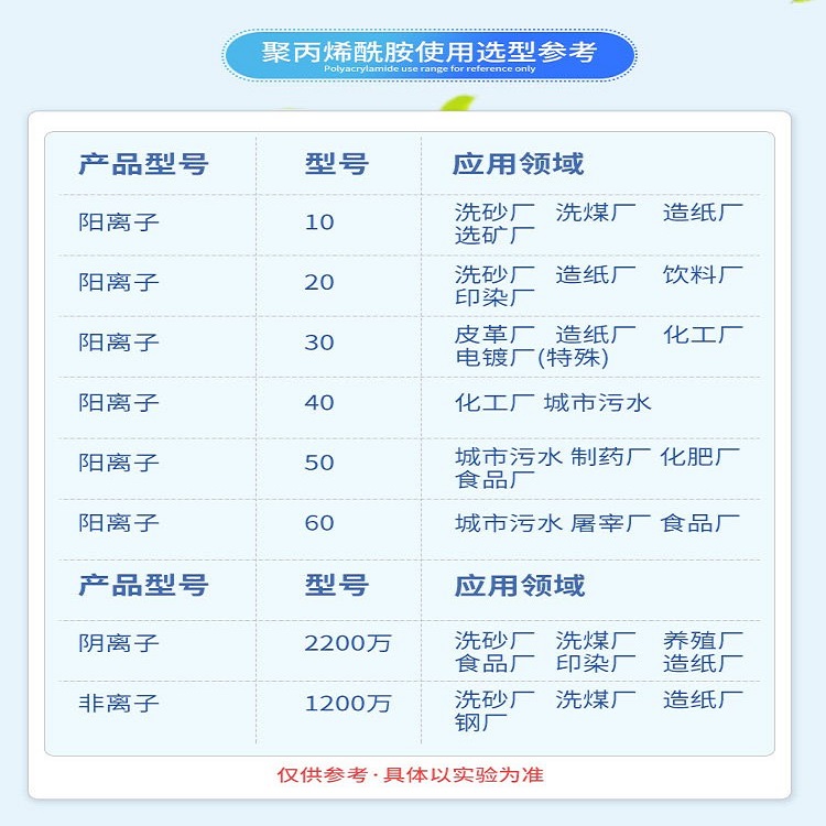 2、用于生活污水和有机废水的处理:本产品在配性或碱性介质中均呈现阳电性,这样对污水中悬浮颗粒带阴电荷的污水进行絮凝沉淀,澄清很有效。如生产粮食酒精废水,造纸废水,城市污水处理厂的废水,啤酒废水,味精厂废水,制糖废水,有机含量高 废水、饲料废水,纺织印染废水等,用聚丙烯酰胺要比用阴离子、非离子聚丙烯酰胺或无机盐类效果要高数倍或数十倍,因为这类废水普遍带阴电荷。