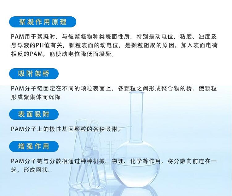 聚丙烯酰胺简称PAM,是一种线形高分子聚合物,是水溶性高分子化合物中应用较为广泛的品种之一,聚丙烯酰胺和它的衍生物可以用作有效的絮凝剂、增稠剂、纸张增强剂以及液体的减阻剂,广泛应用于水处理、造纸石油、煤炭、矿冶、地质、轻纺、建筑等工业部门。不溶于大多数有机溶剂,具有良好的絮凝剂,可以降低液体之间的摩擦阻力,按离子特性可分为阴离子、阳离子、非离子三中类型。